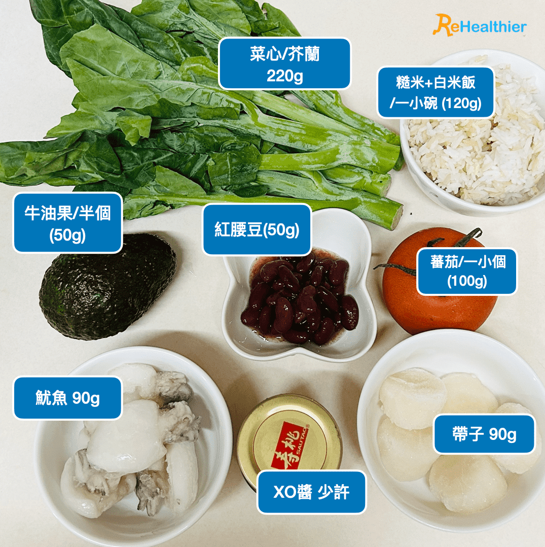 【帶子墨魚炒芥蘭】蕃茄紅腰豆糙米飯