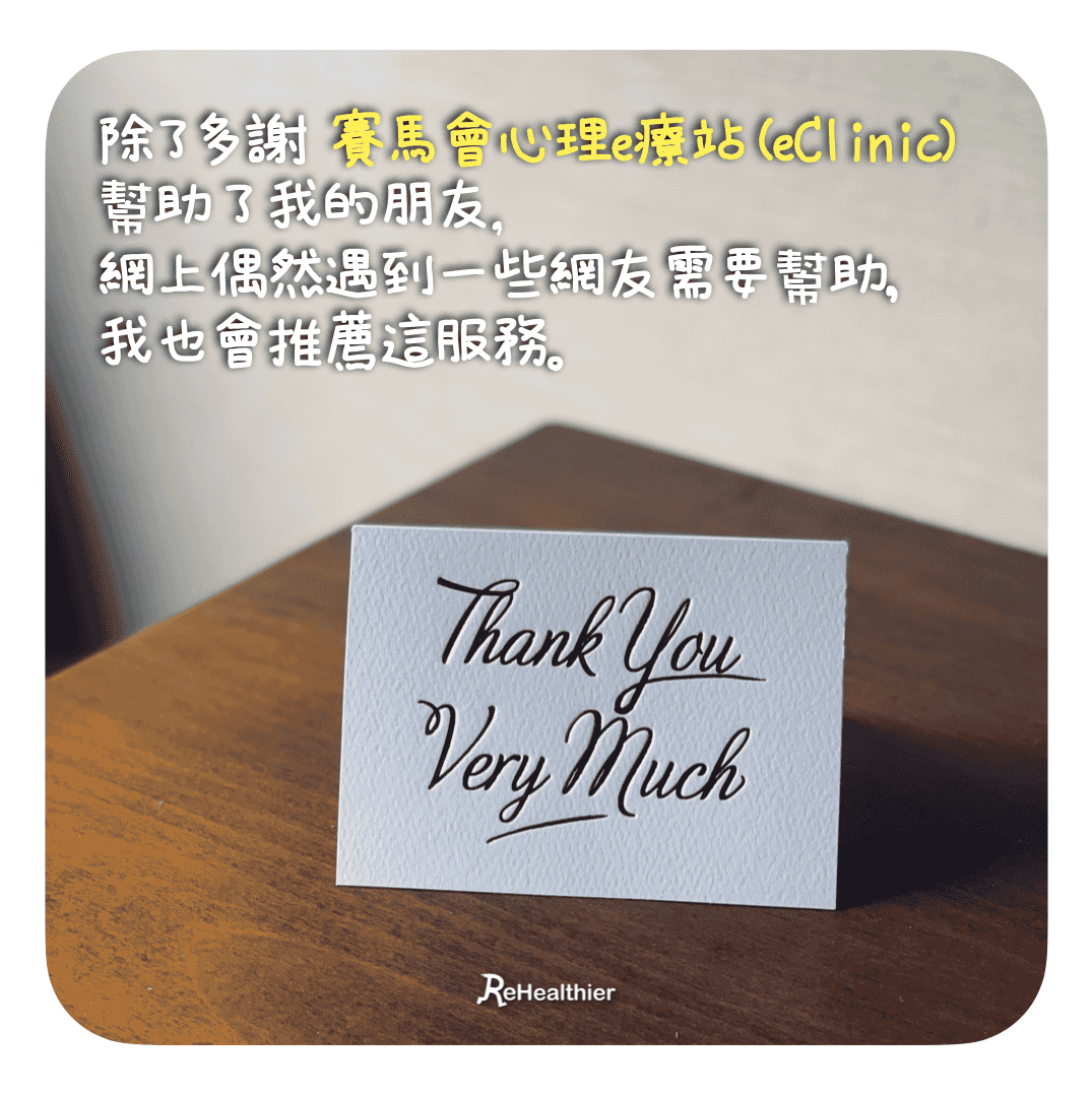 除了多謝 賽馬會心理e療站(eClinic),幫助了我的朋友,網上偶然遇到一些網友需要幫助,我也會推薦這服務。